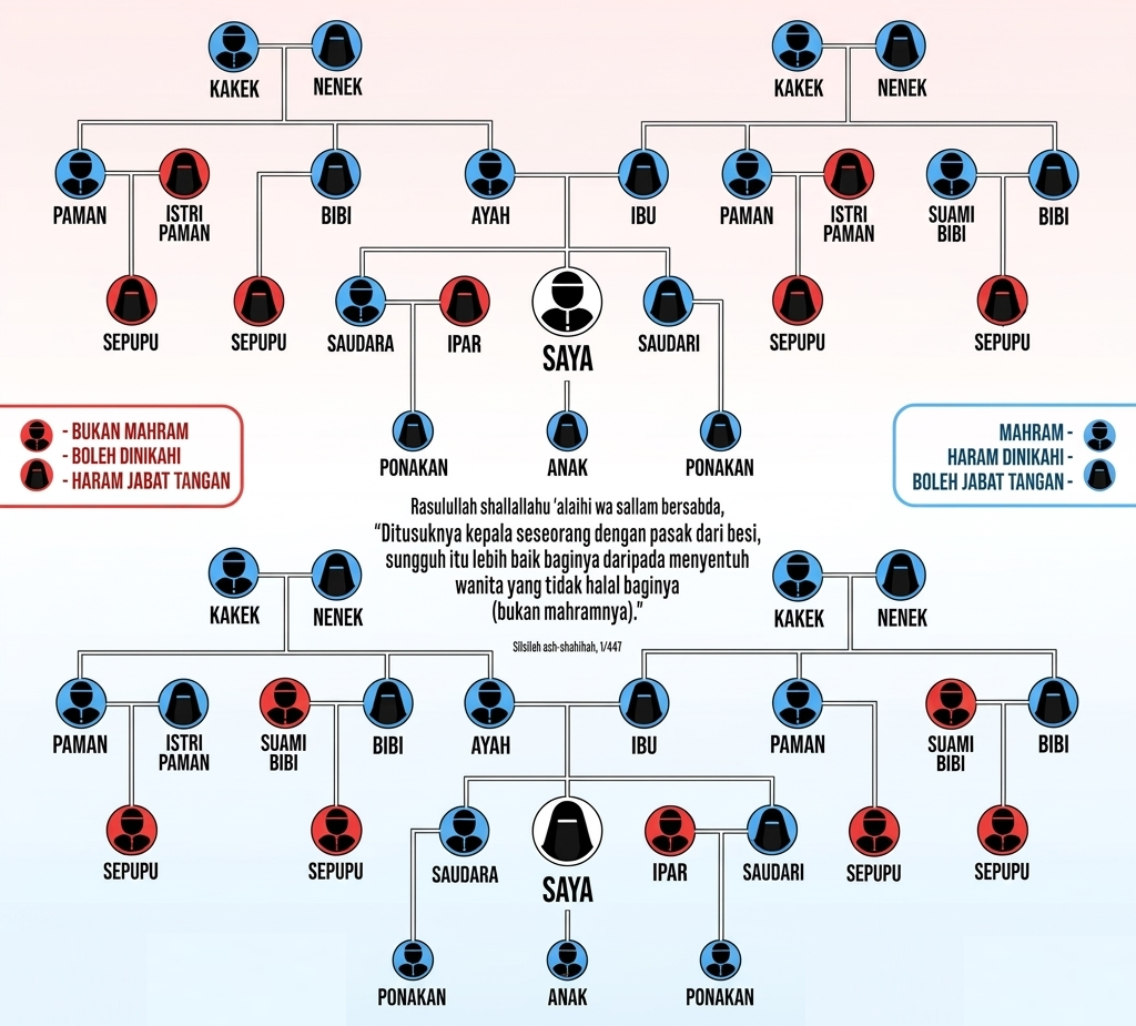 Pun disisi lain, setiap muslim perlu memahami bahwa konsep mahram bukan sekadar soal larangan fisik, tetapi juga kesadaran sosial. Banyak dalil hadits menjelaskan pentingnya menjaga jarak dan adab dalam pergaulan. Dengan memahami batasan ini, setiap muslim tidak terhalang dalam berinteraksi dengan penuh hormat, menghindari fitnah, dan menegakkan etika Islami dalam kehidupan sehari-hari.